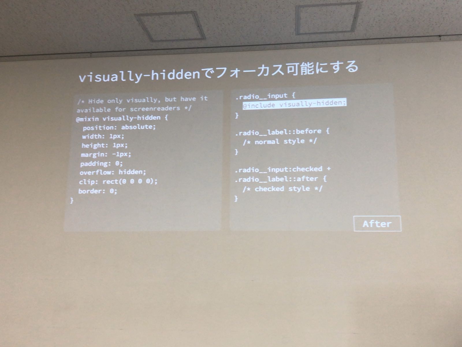 inputにdisplay: noneを指定しているのが原因なので、先ほどのvisually-hiddenで不可視化した上で、フォーカス時のスタイリングをしましょう、というお話でした。